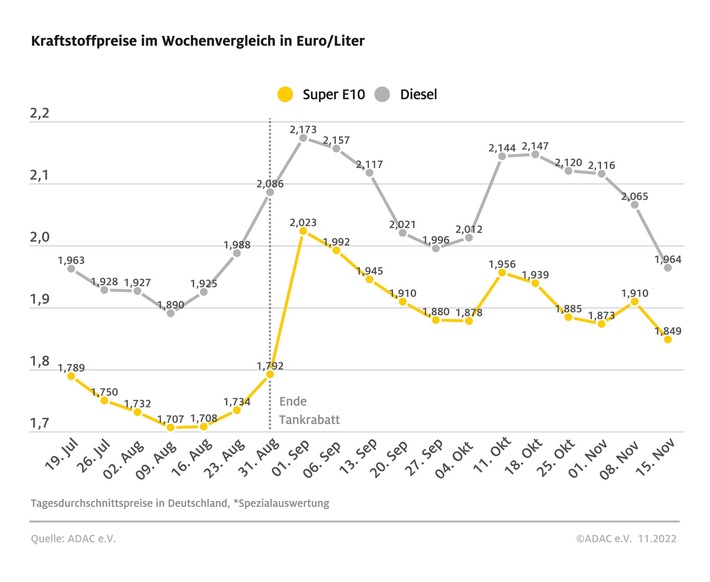 Die Gründe für die aus Autofahrersicht erfreuliche Entwicklung sind vielfältig. So hatten laut ADAC einige Industriezweige in den vergangenen Monaten Diesel als Ersatz für Gas stark nachgefragt und dadurch für einen zusätzlichen Preisanstieg gesorgt. Dieser Nachfrageschub scheint sich mittlerweile wieder abgeschwächt zu haben, was offensichtlich den deutlich überhöhten Dieselpreis fallen lässt. Zudem kommen die Wettbewerbskräfte auf dem Kraftstoffmarkt inzwischen wieder stärker zur Geltung – auch dies ist nach Ansicht des ADAC ein wichtiger Faktor für das Abschmelzen der Spritpreise. Ungeachtet der leichten Entspannung sieht der ADAC jedoch weiter erheblichen Spielraum für Preissenkungen.