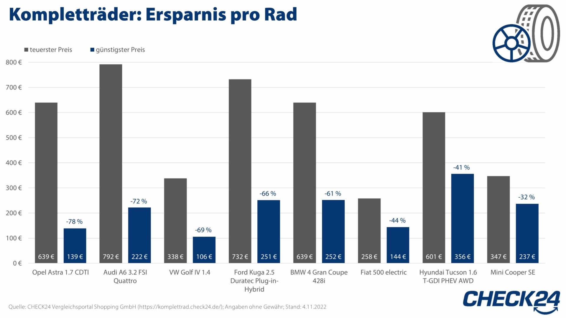 Kompletträder: Ersparnis pro Rad / Quelle: CHECK24 Vergleichsportal Shopping GmbH (https://komplettrad.check24.de/); Angaben ohne Gewähr; Stand: 4.11.2022 / Weiterer Text über ots und www.presseportal.de/nr/73164 / Die Verwendung dieses Bildes für redaktionelle Zwecke ist unter Beachtung aller mitgeteilten Nutzungsbedingungen zulässig und dann auch honorarfrei. Veröffentlichung ausschließlich mit Bildrechte-Hinweis.Bildrechte: CHECK24 Fotograf: CHECK24 GmbH
