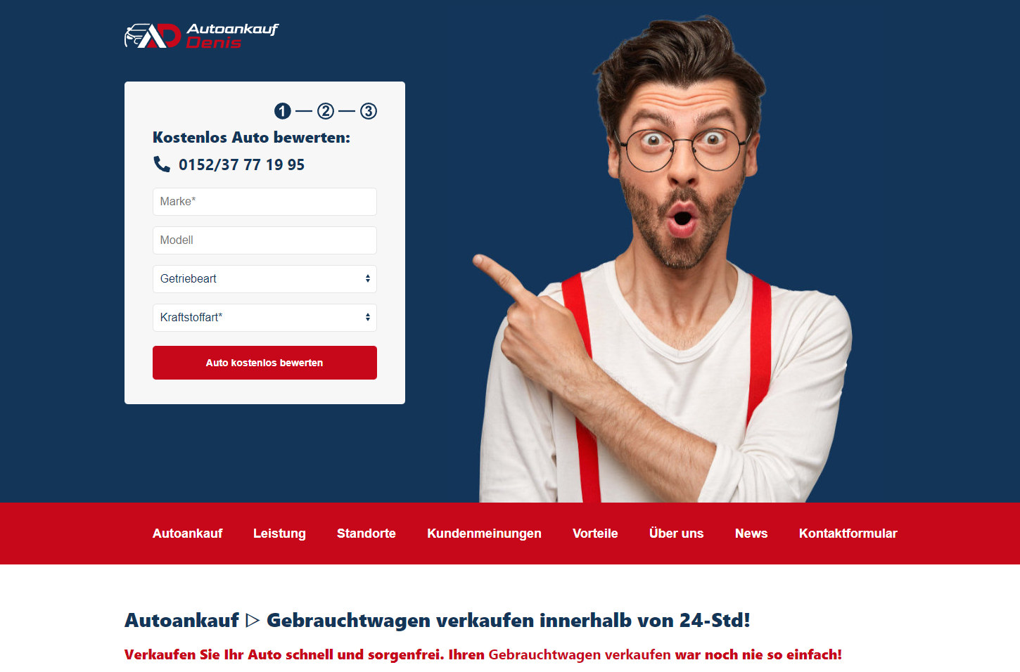 Der Autoankauf Denis ist die Anlaufstelle für den Autoverkauf. Mit fairen Preisen und dem Versprechen, das wir immer einhalten, können wir viel Vertrauen bei den Kunden gewinnen. Wir möchten auch, dass Sie unseren Dienstleistungen vertrauen. Das Team des Autoankauf Denis freut sich auf Sie und sorgt dafür, dass Ihr erster Besuch nicht Ihr letzter sein wird. Wir hoffen auf eine langfristige Zusammenarbeit mit ihnen.