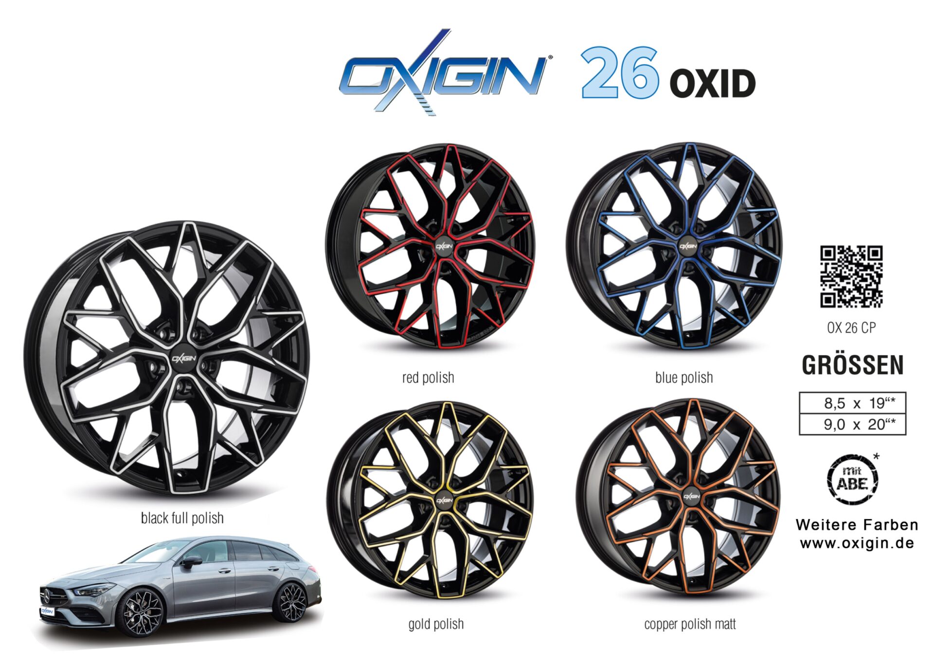 Die Oxigin 26 OXID hat viele Radanbindungen, insbesondere für Audi, BMW, Mercedes, Porsche, VW und viele weitere Fahrzeuge. Selbstverständlich verfügt das Rad auch über eine ABE-Zulassung. Oxigin Alufelgen können Sie lokal in ganz Deutschland beim Reifenfachhandel oder direkt online unter www.oxigin.de 3D konfigurieren und bestellen.