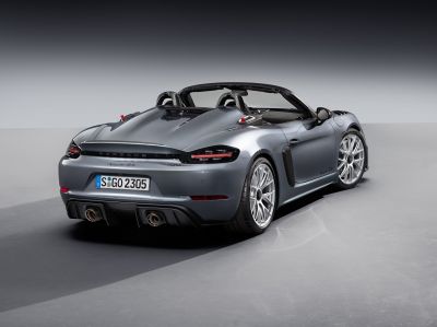 Porsche krönt die Mittelmotor-Modellreihe 718 mit einem Sportwagen, der auf maximalen Fahrspaß ausgelegt ist: Der neue 718 Spyder RS ist das offene Gegenstück zum 718 GT4 RS. Erstmals kommt in einem offenen Mittelmotor-Sportwagen der frei saugende Sechszylinder-Boxer des 911 GT3 mit 368 kW (500 PS) zum Einsatz. Das gleiche Leichtbau-Aggregat mit Hochdrehzahlkonzept treibt auch das Rennfahrzeug Porsche 911 GT3 Cup an. Im 718 Spyder RS mit seinem besonders leichten und puristischen manuellen Verdeck ist der hochemotionale Sound des Motors besonders gut zu erleben. Dazu tragen auch die serienmäßige Leichtbau-Sportabgasanlage aus Edelstahl und die markanten Prozesslufteinlässe seitlich hinter den Kopfstützen bei.