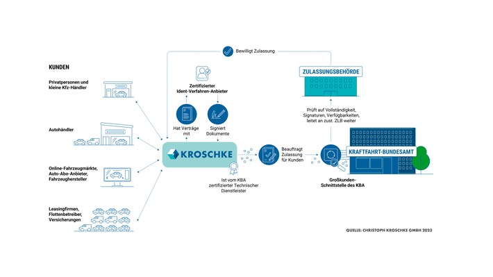 Einfacher geht es mit spezialisierten Zulassungsdiensten, wie z.B. Kroschke. Diese bieten ihre Kund:innen unkomplizierte Beantragungsprozesse und haben den großen Vorteil, dass sie – ebenfalls ab September 2023 – als sogenannter Großkunde direkt an das Kraftfahrt-Bundesamt (KBA) angebunden sein werden (siehe Infografik). Das ist nicht nur für Geschäftskunden wie Autohäuser, Leasingunternehmen oder Vermarktungsplattformen sehr verlockend, die sich so die kostspielige eigene Anbindung sparen können.