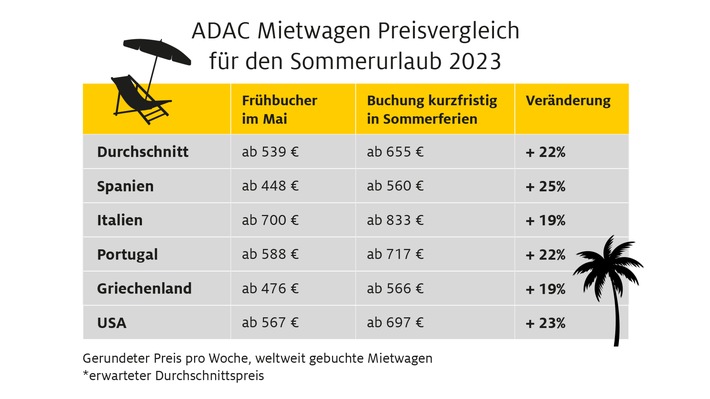 Die Situation auf dem Mietwagenmarkt hat sich laut Tobias Ruoff, Geschäftsführer der ADAC Autovermietung, im Vergleich zum vergangenen Sommer weltweit deutlich entspannt. Musste man in der Hauptferienzeit 2022 noch durchschnittlich 1212 Euro pro Woche bezahlen, sind es in diesem Jahr 539 Euro.