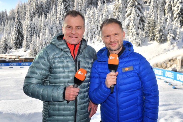 Alexander Ruda und ZDF-Biathlon-Experte Sven Fischer begrüßen die Zuschauer zu