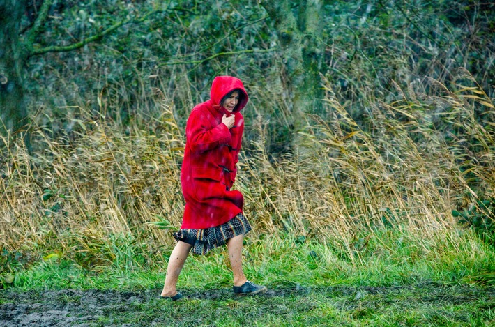 Hanne mit dem roten Mantel im Sturm über ein Feld läuft. Und er ist preiswürdig