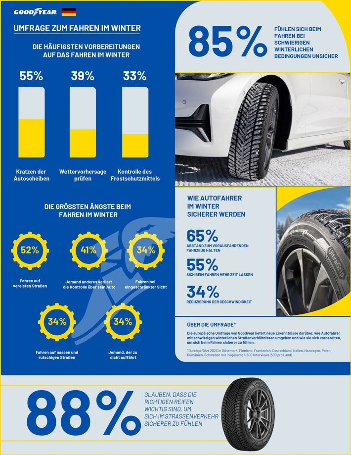 Die Wintersaison steht vor der Tür und mit ihr zahlreiche Herausforderungen auf den Straßen. Die neue Deutschland-Umfrage von Goodyear zeigt, dass viele der 500 befragten Autofahrer im Winter Unsicherheit und Angst am Steuer empfinden und der Mehrheit die Wahl passender Reifen wichtig ist. Vor diesem Hintergrund hat Goodyear in Zusammenarbeit mit dem renommierten Psychologen David Waskuri wichtige Tipps zusammengestellt, um in der kalten Jahreszeit sicherer unterwegs zu sein. Darüber hinaus präsentiert der Reifenhersteller mit dem Goodyear UltraGrip Performance 3 die nächste Generation von Premium-Winterreifen, die sich für anspruchsvolle Winterbedingungen und eine breite Palette von Fahrzeugen eignet.