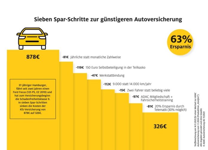 Hohe Ersparnis möglich Die ADAC Autoversicherung hat für einen 37ährigen Autofahrer aus Hamburg die möglichen Einsparungen durch diese Spartipps berechnet (siehe Grafik „Sieben Spar-Schritte zur günstigeren Autoversicherung“). Für den Fahrer eines Ford Focus ergab sich dabei eine Ersparnis von 552 Euro oder 63 Prozent. Die Prämie für die Haftpflicht- und Teilkaskoversicherung sank von 878 Euro auf 326 Euro im Jahr.