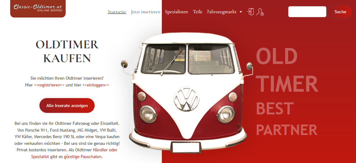 Classic Oldtimer ist Österreichs führende Online-Börse für Oldtimer-Fahrzeuge und bietet eine umfassende Plattform für Oldtimer-Liebhaber. Diese Online-Plattform ermöglicht den unkomplizierten Kauf und Verkauf von Klassikern und Ersatzteilen, darunter renommierte Marken wie Porsche, Ford Mustang und VW Käfer. Als eine der größten Oldtimer-Börsen im deutschsprachigen Raum können Privatpersonen kostenlos Inserate erstellen und gezielt nach speziellen Fahrzeugen oder Einzelteilen suchen.