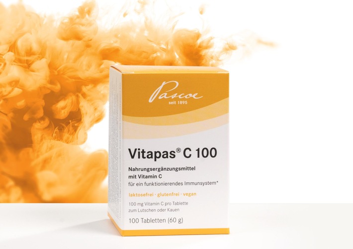 Vitapas® C 100 ist ein Nahrungsergänzungsmittel mit Vitamin C. Die Glasdose