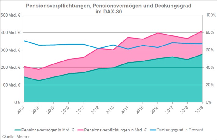 Frankfurt (ots) – Der Wert der Pensionsverpflichtungen der DAX 30-Unternehmen ist im Jahr 2019 von 365,3 Mrd. Euro auf etwa 409 Mrd. Euro gestiegen. Im gleichen Zeitraum stieg das Pensionsvermögen im IFRS-Abschluss von 245,6 Mrd. Euro auf etwa 274 Mrd. Euro. Der Deckungsgrad der Pensionsverpflichtungen liegt wie im Vorjahr bei etwa 67 Prozent. Die Auswirkungen des Coronavirus führen jedoch zu erheblichen Belastungen im gerade begonnenen Geschäftsjahr 2020. Die Verpflichtungen erreichen neue Rekordhöhen, während das Vermögen an Wert verloren hat. Dies sind die Ergebnisse einer Hochrechnung und Schätzung des Beratungsunternehmens Mercer auf Basis der bereits veröffentlichten Geschäftsberichte der DAX 30-Unternehmen sowie aktueller Kapitalmarktinformationen.