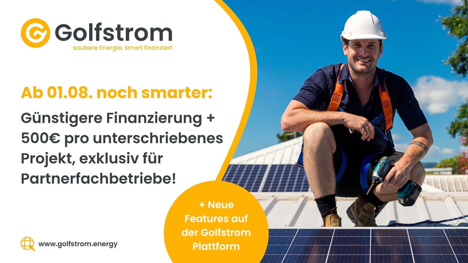 Golfstrom Energy verbessert Finanzierungskonditionen für Solaranlagen und bietet Partnerfachbetrieben 500 € Sommerprämie pro abgeschlossenem Projekt.