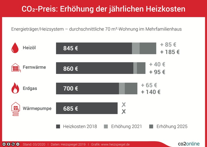 Zu Beginn beträgt der CO2-Preis 25 Euro pro Tonne CO2. In der 70 Quadratmeter großen Beispielwohnung im Mehrfamilienhaus mit Erdgas-Zentralheizung steigen die jährlichen Heizkosten damit im Schnitt um 65 Euro. In Häusern mit Heizöl-Heizungen werden Bewohner der Beispielwohnung 85 Euro mehr zahlen, bei Fernwärme 40 Euro.