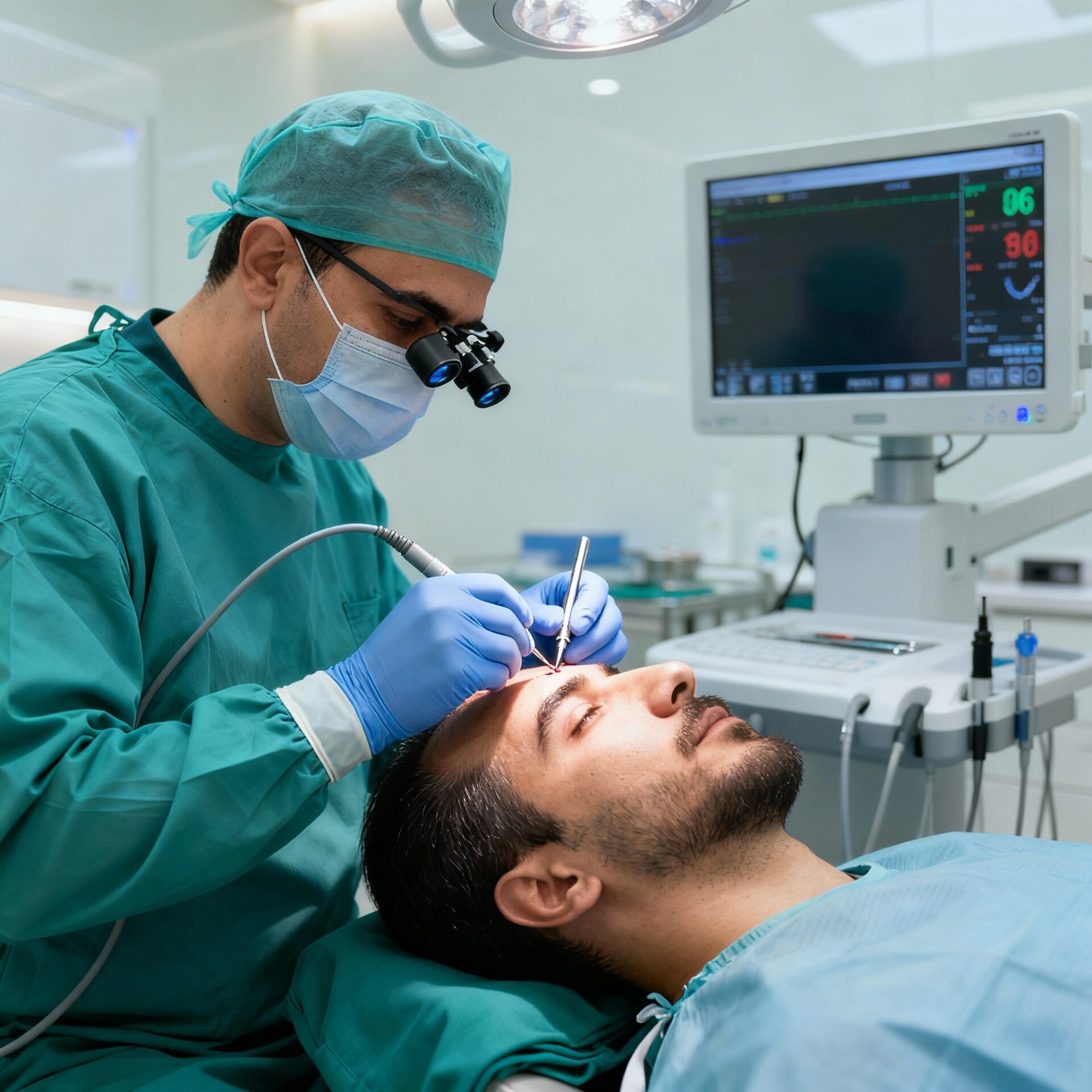 Haartransplantation Klinik Türkei – moderner OP-Bereich. Chirurg führt FUE-Haartransplantation in einer modernen türkischen Klinik durch. Bild einer professionellen Haartransplantationsklinik in der Türkei mit medizinischem Team und modernem OP-Equipment
