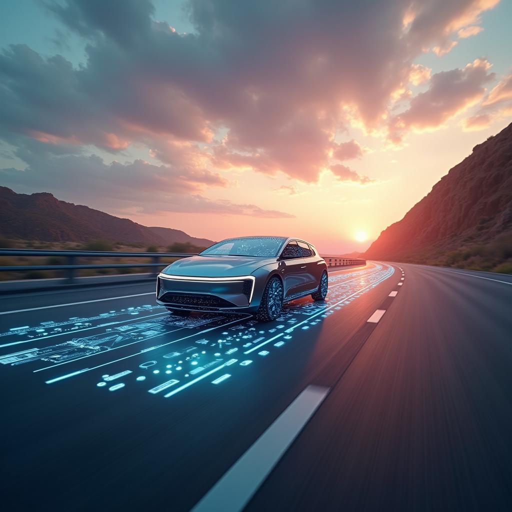 Autonomes Fahren 2025 – Sensoren und KI im Straßenverkehr. Autonom fahrendes Fahrzeug mit sichtbaren Lidar- und KI-Elementen auf einer modernen Autobahn. Ein futuristisches autonomes Fahrzeug bewegt sich auf einer modernen Straße und zeigt die Integration von Sensorfusion, Lidar und KI-Navigation.