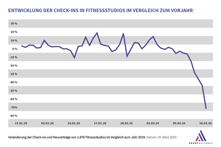 Für Studiobetreiber hat das Jahr dabei gut angefangen: Laut den Ergebnissen der Sport Alliance stieg die Anzahl der Studiobesuche von Januar bis Februar gegenüber 2019 um 3 Prozent. Darüber hinaus zählen die Analysten durchschnittlich 2 Prozent mehr Mitgliedschaften als im Vorjahr. Seit der elften Kalenderwoche befinden sich die Werte im Sturzflug.