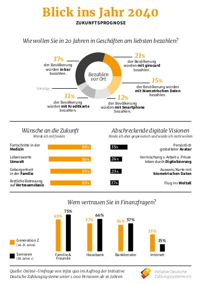 Das Bezahlen der Zukunft soll in erster Linie bequem sein und vertraut wird auf Bewährtes: Selbst in 20 Jahren sehen die Befragten daher Bargeld (37 Prozent) und die girocard (21 Prozent) als die beiden führenden Systeme, mit denen sie auch künftig am liebsten vor Ort bezahlen möchten. Überraschenderweise können sich mehr Personen vorstellen, dass sie 2040 an der Kasse am liebsten rein mit biometrischen Merkmalen (15 Prozent) bezahlen, als mit dem eigenen Smartphone (12 Prozent). Rechnet man das Bezahlen mit der Kreditkarte (11 Prozent) zu den girocard-Befürwortern hinzu, liegen die klassische Kartenzahlung und das Bargeld nahezu gleich auf.