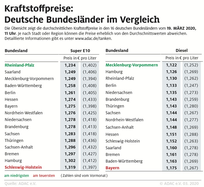 München (ots) – Autofahrer, die Benzin benötigen, tanken derzeit in Rheinland-Pfalz am günstigsten. Laut aktuellem Bundesländervergleich kostet ein Liter Super E10 dort durchschnittlich 1,234 Euro. Auf Platz 2 folgen das Saarland und Mecklenburg-Vorpommern. Schlusslicht ist Schleswig-Holstein, wo man für einen Liter Super E10 im Mittel 1,319 Euro und damit 8,5 Cent mehr als in Rheinland-Pfalz bezahlen muss. Daraus ergibt sich bei einer 40-Liter-Tankfüllung ein Aufpreis von immerhin 3,40 Euro.