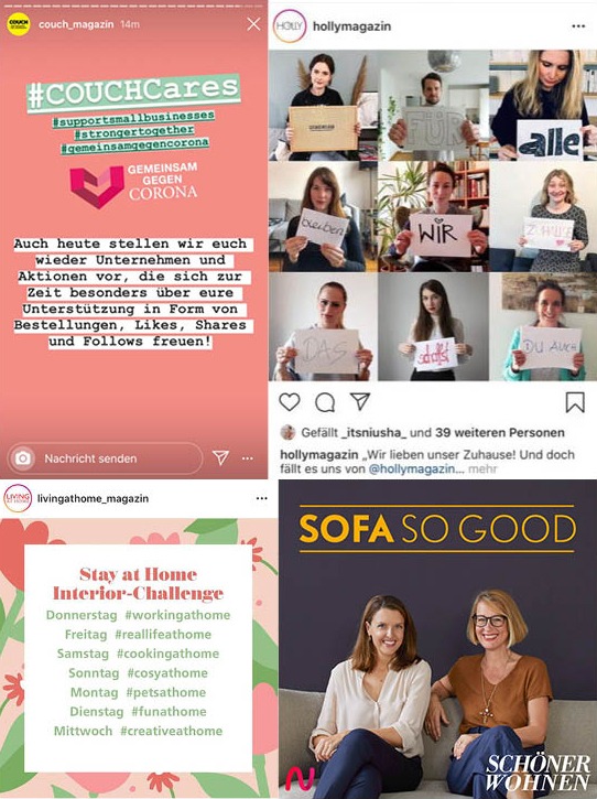 – Beteiligung aller Marken an der Aktion #WirBleibenZuhause – Podcast „Sofa So Good“ mit Sonderfolge „SCHÖNER WOHNEN in Quarantäne“ – Themenschwerpunkte im Webangebot von SCHÖNER WOHNEN.de – LIVING AT HOME initiiert die #stayathomeinteriorchallenge – COUCH startet #COUCHCares zur Unterstützung kleiner Unternehmen und Freelancer – HOLLY unterstützt lokale Geschäfte und die Kreativbranche