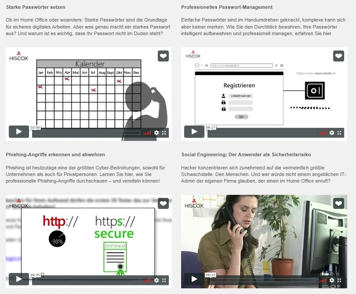 Hiscox stellt aus diesem Grund insgesamt vier Lernvideos der Öffentlichkeit zur Verfügung, die normalerweise exklusiv den Versicherungsnehmern und Maklern vorbehalten sind, die Zugriff auf die Hiscox Business Academy haben. Mit den kurzen Videos wird Wissen vermittelt zu den Themen „Starke Passwörter setzen“, „Professionelles Passwort-Management“, „Phishing-Angriffe erkennen und abwehren“ sowie „Social Engineering: Der Anwender als Sicherheitsrisiko“. Letzteres ist eine immer häufiger praktizierte Methode von Hackern, sich z.B. per Anrufen oder persönlichen Mails das Vertrauen von Menschen zu erschleichen und damit an deren Passwörter oder andere sensible Daten zu kommen.