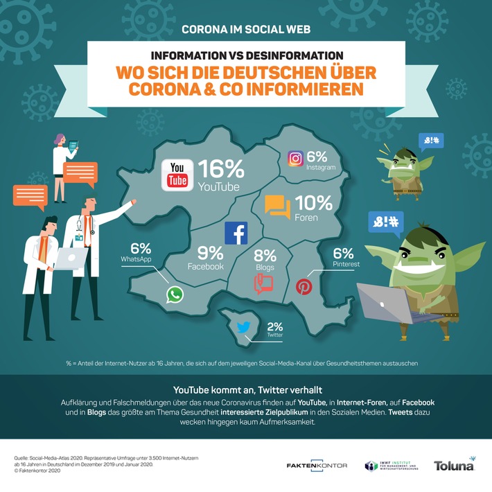 Gerüchte und Falschinformationen über das neue Coronavirus in den Sozialen Medien gefährden den Kampf gegen die schnelle Ausbreitung des Covid-19-Erregers und gefährden Menschenleben. Um gegenzusteuern, sollte die Aufklärung über Sars-CoV-2 im Social Web vor allem auf YouTube und in Internet-Foren erfolgen. Denn auf diesen Kanälen tauschen sich mehr Nutzer über Gesundheitsfragen aus als irgendwo sonst im Web 2.0. 16 Prozent aller Internet-Nutzer ab 16 Jahren in Deutschland befassen sich auf YouTube mit Gesundheitsthemen, und jeder zehnte nutzt dafür klassische Internet-Foren. Bemühungen über Twitter dürften in der Bundesrepublik hingegen weitgehend wirkungslos verpuffen. Das zeigen die aktuellen Zahlen über das Informationsverhalten von Internet-Nutzern in der Sozialen Medien aus dem aktuellen, repräsentativen Social-Media-Atlas 2020 der Hamburger Kommunikationsberatung Faktenkontor und des Marktforschers Toluna.