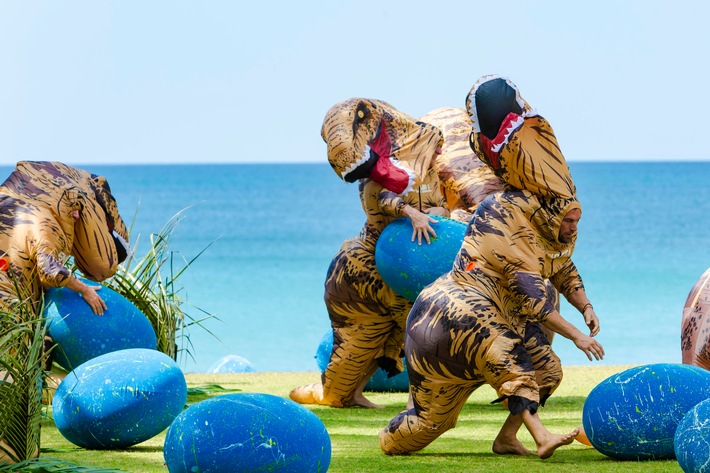– In jeder Folge werden durch ein heiteres Geschicklichkeitsspiel zwei Teamkapitäne ermittelt (Folge eins: „Dino, rette deiner Eier“*)