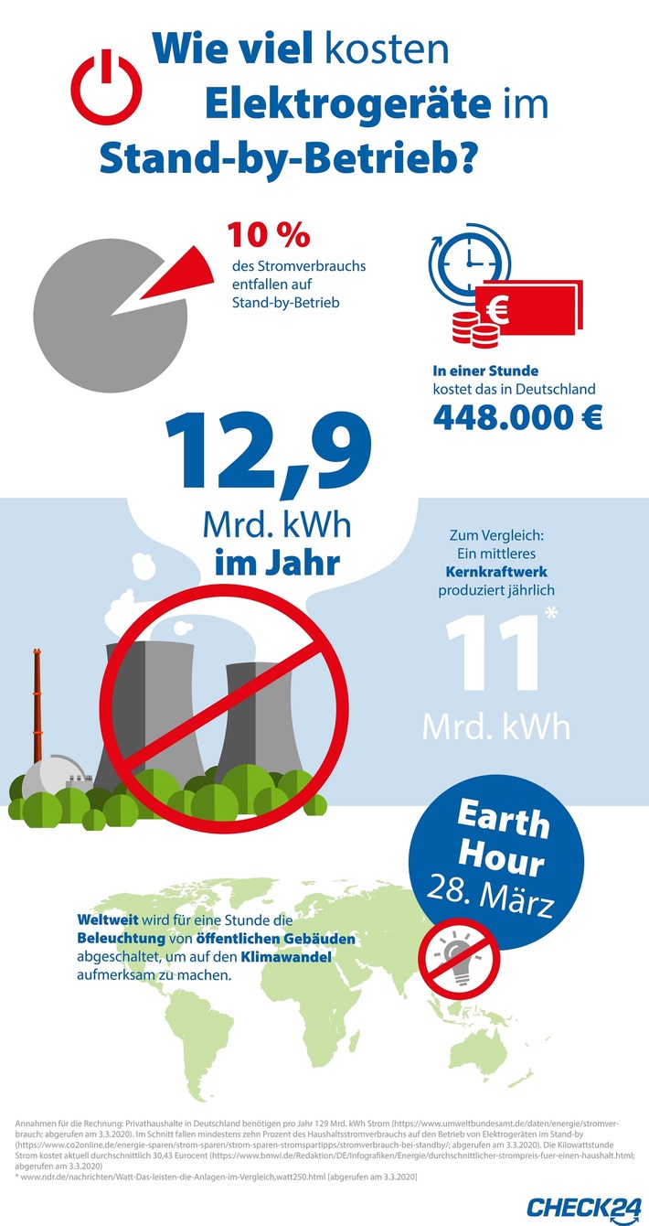 1)Annahmen für die Rechnung: Privathaushalte in Deutschland benötigen pro Jahr 129 Mrd. kWh Strom ( https://www.umweltbundesamt.de/daten/energie/stromverbrauch ; abgerufen am 3.3.2020). Im Schnitt werden mindestens zehn Prozent des Haushaltsstromverbrauchs auf den Betrieb von Elektrogeräten im Stand-by verwendet ( http://ots.de/J0MgiH ; abgerufen am 3.3.2020). Die Kilowattstunde Strom kostet aktuell durchschnittlich 30,43 Eurocent ( http://ots.de/CXVSG8 ; abgerufen am 3.3.2020). – https://www.check24.de/strom-gas/ratgeber/earth-hour-stand-by-kosten/