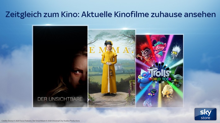 – Neue Filme zeitgleich zum Kino jetzt im Sky Store ansehen – Start mit „Emma“ und „Der Unsichtbare“ am 26. März – Den Blockbuster „Trolls World Tour“ ab 23. April direkt nach Hause streamen – Sky Store ist mit Sky Q, Sky+, im Web und per Android- und iOS-App verfügbar