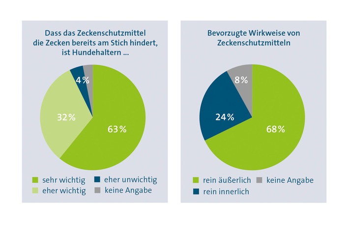 93 Prozent der Befragten gaben an, dass es ihnen wichtig ist, dass das Zeckenschutzmittel ihres Tieres die Parasiten bereits am Stich hindert (fachsprachlich repelliert). Rund 7 von 10 Hundehaltern (68 %) bevorzugen außerdem eine rein äußerliche Wirkweise des Zeckenschutzpräparats. Dabei verteilen sich die Wirkstoffe über den natürlichen Fettfilm auf der gesamten Hautoberfläche und im Fell des Tieres und wirken dort gegen äußere Parasiten wie Zecken. Nur jeder vierte Hundehalter (24 %) favorisiert ein Produkt mit rein innerlicher Wirkung.