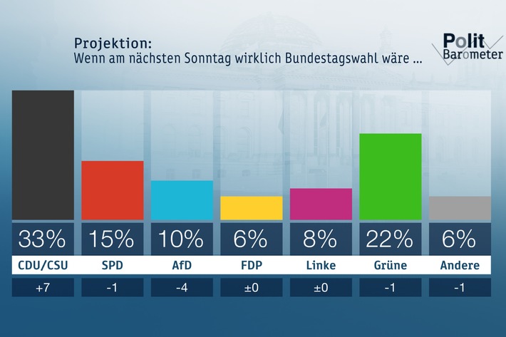 Vom Krisenmanagement der Bundesregierung profitiert ganz klar die Union. Wenn am nächsten Sonntag wirklich Bundestagswahl wäre, käme sie auf 33 Prozent, ihr bester Wert seit fast zwei Jahren. Im Vergleich zur letzten Umfrage ist das ein Plus von sieben Prozentpunkten, das ist der höchste Anstieg, den es jemals in der Politbarometer-Projektion gab. Die SPD erreichte 15 Prozent (minus 1) und die AfD hätte mit nur noch 10 Prozent (minus 4) deutliche Einbußen. Die FDP bliebe unverändert bei 6 Prozent und die Linke unverändert bei 8 Prozent. Die Grünen lägen bei 22 Prozent (minus 1) und die anderen Parteien zusammen bei 6 Prozent (minus 1). Damit hätte neben einer Koalition aus CDU/CSU und Grünen jetzt auch wieder ein Bündnis aus CDU/CSU und SPD eine knappe Mehrheit.