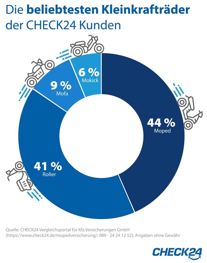 Moped und Roller sind die beliebtesten Kleinkrafträder. Insgesamt versichern 85 Prozent der CHECK24-Kunden diese beiden Fahrzeugtypen bei den motorisierten Zweirädern. Mofas (neun Prozent) und Mokicks (sechs Prozent) machen einen deutlich geringeren Anteil aus.