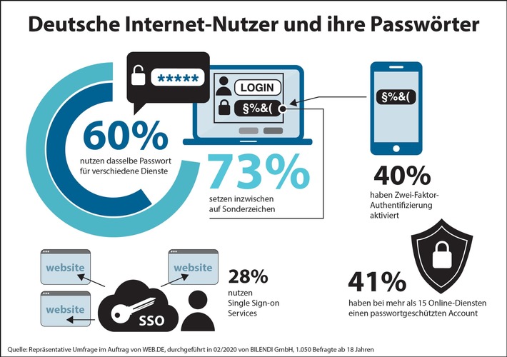 Karlsruhe (ots) – WEB.DE ruft am Tag der Passwort-Sicherheit dazu auf, das eigene Passwortverhalten zu prüfen – 60 Prozent nutzen ein und dasselbe Passwort für verschiedene Dienste – 28 Prozent nutzen Single Sign-on Services – 40 Prozent haben Zwei-Faktor-Authentifizierung aktiviert