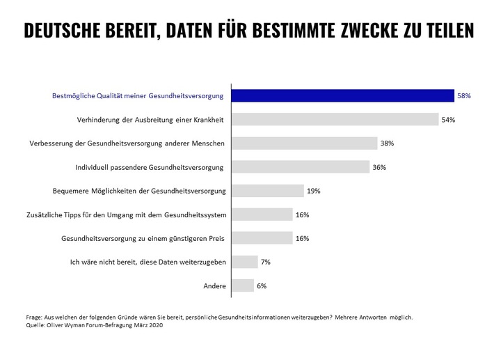 Dabei sind sich die Deutschen der Sensibilität ihrer Daten durchaus bewusst. „Nicht zuletzt hat die Einführung der DSGVO vor zwei Jahren dazu beigetragen, dass in Deutschland eine große Aufmerksamkeit für das Thema Datenschutz vorhanden ist“, sagt Kai Bender, Deutschland- und Österreichchef von Oliver Wyman. „Gleichzeitig wissen die Deutschen aber auch um den Wert der Daten und die Vorteile, die sich dadurch realisieren lassen.“ Das spiegelt sich auch in den Befragungsergebnissen: 58 Prozent der Befragten gaben an, ihre Gesundheitsdaten teilen zu wollen, um die bestmögliche Qualität ihrer Gesundheitsversorgung sicherzustellen, 54 Prozent um die Ausbreitung von Krankheiten in ihrer Umgebung einzudämmen.
