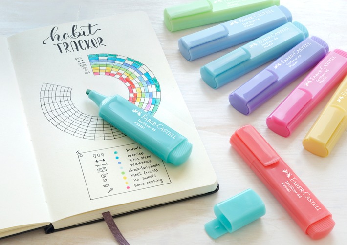 Immer vernetzt und ständig online? Jetzt ist die Zeit reif für analoge Ausgleichstätigkeiten. Wer Freude am Bullet Journaling und Mood Tracking hat, kommt an Textlinern nicht vorbei. Längst haben auch kreative Trendsetter wie Studygrammer und Handletterer die bunten Marker für sich und ihre Kunstwerke entdeckt. Als saisonale Favoriten erobern jetzt Textliner in zarten Pastelltönen wie Ultramarin, Lichtgrün und Vanille die Schreibtische. Für variantenreiche Kreativität sorgt die vielseitige Keilspitze: Ob feine oder breite Linien – die Textliner gehen bei jeder Technik mit. Ein klares Zeichen für die Umwelt: Die Tinte der Marker ist wasserbasiert und eignet sich für alle gängigen Papiere. Erhältlich sind die Textliner in Pastellfarben in diversen Etuis und als besonderer Hingucker auch als Einzelstift mit angesagtem Handlettering-Print.