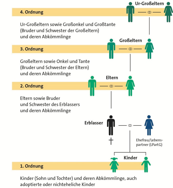 Nach der gesetzlichen Erbfolge erben zunächst die Eltern, wenn Sie weder Kinder noch Enkelkinder oder einen Ehepartner haben. Leben Vater und Mutter nicht mehr, erben die Geschwister und deren Nachkommen, also Neffen und Nichten. Die gesetzliche Erbfolge setzt sich fort über Onkel und Tanten bis hin zum Fiskus.