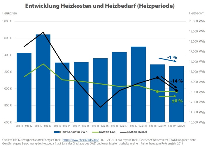 – Heizbedarf von September 2019 bis März 2020 etwa auf Vorjahresniveau – Heizölpreis im Abwärtstrend: Heizen mit Öl 14 Prozent günstiger als im Vorjahr – Alternativtarife aktuell ein Drittel günstiger als Gasgrundversorgung
