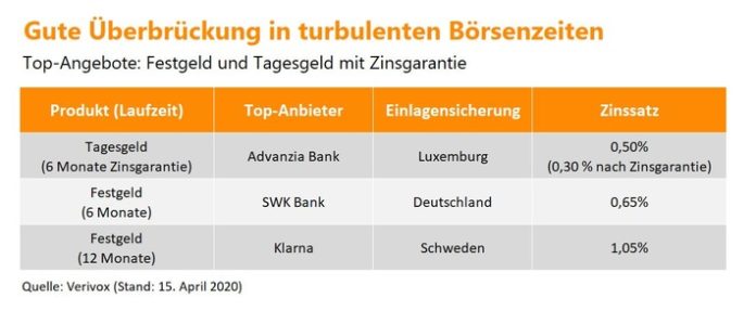 Heidelberg (ots) – Der Corona-Crash an der Börse hat historische Ausmaße. Um Verluste zu begrenzen, haben viele Anleger ihre Aktien und Fonds abgestoßen und verfügen nun über flüssiges Kapital. Verivox-Berechnungen zeigen, wie Sparer das Geld gewinnbringend zwischenparken und sich damit Hunderte Euro Zinsen sichern.