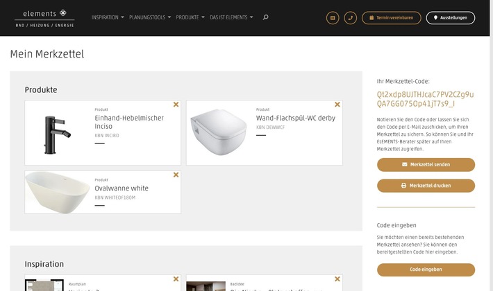 Schnell gemerkt, schon gemacht. Besonders praktisch: Sind ein Produkt oder eine Idee auf dem Merkzettel hinzugefügt, generiert ELEMENTS einen automatischen Code, über den der Merkzettel künftig jederzeit bequem aufgerufen werden kann. Über das Abspeichern von Produktfavoriten hinaus bietet die Merkzettel-Funktion die Möglichkeit, Inhalt und Inspiration aus den Rubriken „Badideen“, „Kreative Raumkonzepte“ oder die Ergebnisse des Badtyp-Tests zu vermerken – und damit die Grundlage für eine noch individuellere Beratung zu schaffen.