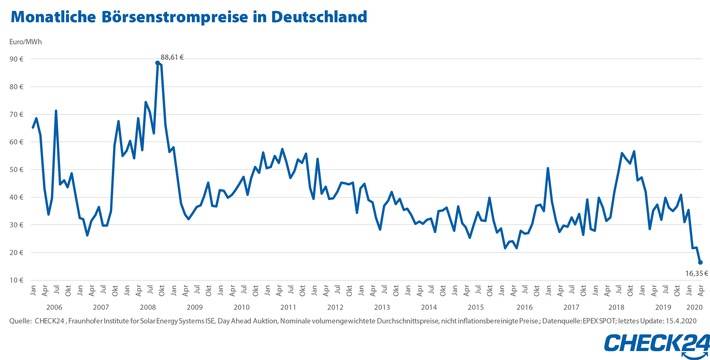Strom ist an der Börse derzeit so günstig wie lange nicht. Im Durchschnitt kostet eine Megawattstunde im April 16,35 Euro. Im Vergleich zur Preisspitze im September 2008 kaufen Stromanbieter (https://www.check24.de/strom/stromanbieter/) aktuell um 82 Prozent günstiger ein. Der Wert im April ist nochmals knapp 25 Prozent geringer als im Vormonat März (21,70 Euro).*