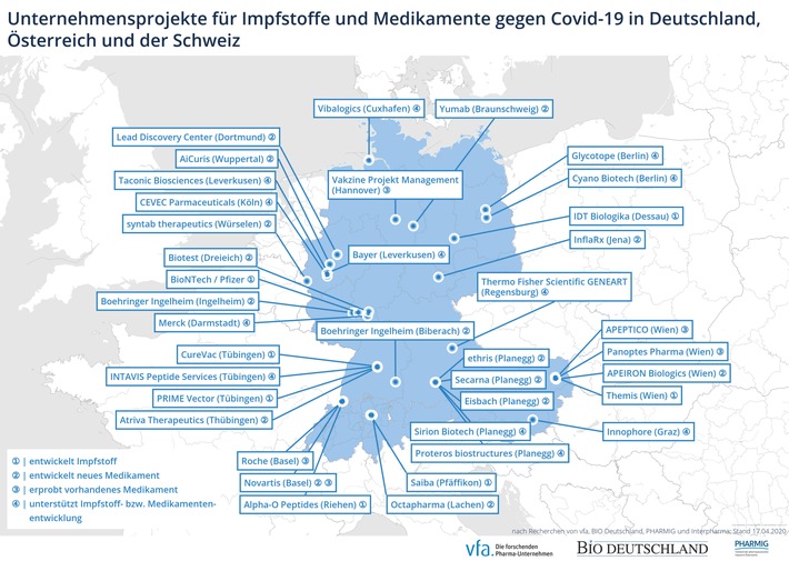 Berlin und Wien (ots) – Die ganze Welt hofft auf therapeutische Medikamente und Impfstoffe gegen die von SARS-CoV-2 verursachte Corona-Krankheit Covid-19. Forschende Pharma- und Biotech-Unternehmen in Deutschland, Österreich und der Schweiz spielen dabei eine wichtige Rolle. Die gemeinsame interaktive Standortkarte von BIO Deutschland, PHARMIG und vfa zeigt, wo Unternehmen in diesen drei Ländern daran arbeiten. Sie findet sich unter: