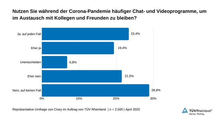 Köln (ots) – In Zeiten der Corona Krise arbeiten vermehrt Menschen aus dem Homeoffice heraus. Sie nutzen verstärkt Programme mit Chat-, Video- und Konferenzfunktionen, um im Austausch mit den Kolleginnen und Kollegen zu bleiben – aber auch mit Freunden und Verwandten. Eine von TÜV Rheinland in Auftrag gegebene Umfrage des Marktforschungsinstituts Civey zeigt, dass knapp 43 Prozent solche Tools und Programme häufiger nutzen als vor der Corona-Pandemie. Bei der Nutzung tun sich gerade die Anbieter hervor, mit denen man schnell und unkompliziert Meetings aufsetzen und Teilnehmer einladen kann. Dabei zeichnen sich diese Kollaborations-Tools vor allem dadurch aus, dass man keine aufwändigen Registrierungsprozesse vollziehen muss oder Freigaben von der hauseigenen IT benötigt. Bei dem Einsatz der oftmals schicken Anwendungen werden allerdings kaum Fragen zur Cybersecurity gestellt.