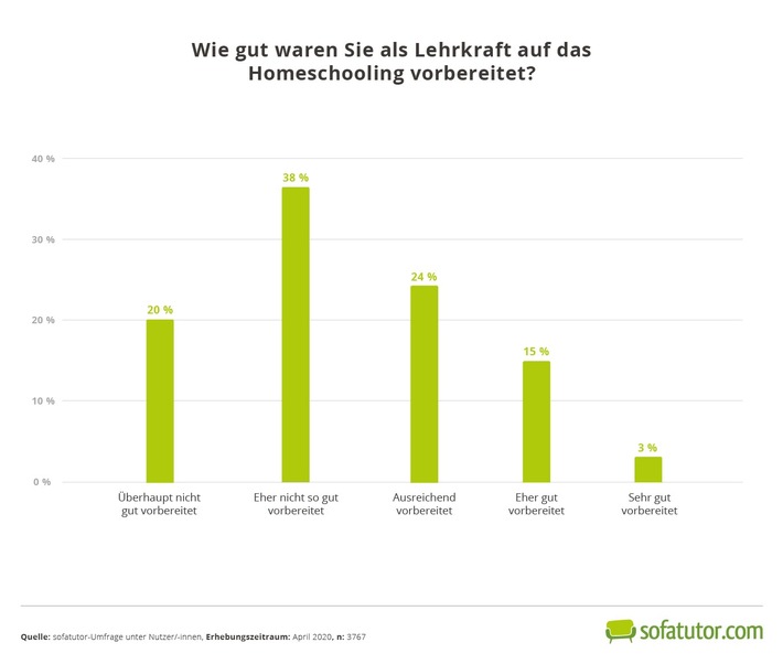 Eine aktuelle Umfrage der Online-Lernplattform sofatutor zeigt nun, wie Homeschooling bei Lehrkräften und Eltern ankommt. Das Ergebnis: Mehr als die Hälfte der Lehrkräfte (58 %) fühlt sich schlecht darauf vorbereitet. Und 45 Prozent der Eltern geben an, dass sie sich nicht gut von Schulen und Lehrkräften abgeholt fühlen. Die Grundlage bilden Antworten von 3767 Lehrkräften und 2867 Eltern, die das Angebot von sofatutor während der Coronakrise nutzen.