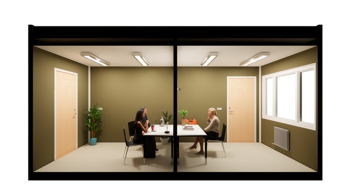 Die jüngste Lösung von Algeco sind modulare Besuchsräume für Senioren- und Pflegeheime. Die knapp fünfzehn Quadratmeter großen Container ermöglichen wieder sichere, direkte Begegnungen zwischen den Bewohnern und ihren Angehörigen von Angesicht zu Angesicht und wirken so der belastenden Isolation und Einsamkeit der alten Menschen entgegen. Die Einheiten haben in jeder Hälfte eine Eingangstür, barrierefreie Zugänge und sind in der Mitte durch eine Glaswand unterteilt. Der gemeinsame Plausch in geschützter Atmosphäre wird per Funk übertragen.
