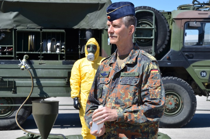 Bonn (ots) – Hygiene ist eine der wichtigsten Maßnahmen, wenn es darum geht, sich vor dem Corona-Virus zu schützen. Die aktuelle Lage in Deutschland, Europa und der Welt hat aber dafür gesorgt, dass der Markt für Desinfektionsmittel wie leergefegt ist. Im Freistaat Bayern arbeiten daher ABC-Abwehrkräfte der Bundeswehr seit gut einer Woche daran, durch ein patentiertes chemisch-technisches Verfahren Desinfektionsmittel für Flächen im großen Umfang herzustellen. Damit reagiert die Bundeswehr auf ein Amtshilfeersuchen des Bayerischen Staatsministeriums des Inneren, welches sich an das Kommando Territoriale Aufgaben der Bundeswehr in Berlin gewandt hatte. Mit den auf dem Gelände der Bundeswehruniversität München produzierten Desinfektionsmitteln können unter anderem große Flächen wie zum Beispiel Fußböden in Krankenhäusern, Altenheimen und öffentlichen Gebäuden, aber auch ganze Straßen desinfiziert werden. Durch den Einsatz der modernen mobilen Wasseraufbereitungsanlagen und robusten Dekontaminationstechnik der ABC-Abwehrtruppe kann so rasch und bedarfsgerecht eine kurzfristig benötigte große Menge an Desinfektionsmittel hergestellt werden. Bislang haben die Soldatinnen und Soldaten des ABC-Abwehrkommandos aus Bruchsal bereits 3.000 Liter des Desinfektionsmittels hergestellt. Der Inspekteur der Streitkräftebasis und Nationale Territoriale Befehlshaber, Generalleutnant Martin Schelleis, hob bei seinem Besuch vor Ort diese Spezialfähigkeit der ABC-Abwehrtruppe hervor und lobte die Professionalität und Motivation, mit der die Soldaten der Streitkräftebasis vorgehen. Er stellte zudem bei Bedarf und auf Anfrage die Unterstützung mit dieser Fähigkeit auch an anderer Stelle in Aussicht. Der als Vertreter der bayerischen Staatsregierung anwesende bayerische Innenminister Joachim Herrmann unterstrich darüber hinaus die „supergute Zusammenarbeit“ mit der Bundeswehr. Das Verfahren ist patentrechtlich geschützt. Der Patentinhaber ist Reservist der Bundeswehr und ABC-Abwehrsoldat und stellt der Bundeswehr in dieser speziellen Zeit das von ihm entwickelte Verfahren zur Verfügung. Außer ihm darf es derzeit nur die ABC-Abwehrtruppe der Bundeswehr herstellen und verteilen. Der Unterschied zu herkömmlichen alkoholbasierten Desinfektionsmitteln besteht in der Verwendung von Essigsäure als Grundlage für die Herstellung des neuen Mittels. Essigsäure ist im Gegensatz zu Alkohol in der jetzigen Zeit keine knappe Ressource auf dem Markt. Damit leisten die ABC-Abwehrkräfte der Bundeswehr einen weiteren wichtigen Beitrag im Kampf gegen COVID-19. Oberst Klaus Werner Schiff, Kommandeur des ABC-Abwehrkommandos: „Wir werden in unseren Grundfähigkeiten gefordert und bringen sowohl unser Fachwissen als auch unser Material zum Schutz unserer Bevölkerung wirkungsvoll zum Einsatz.“