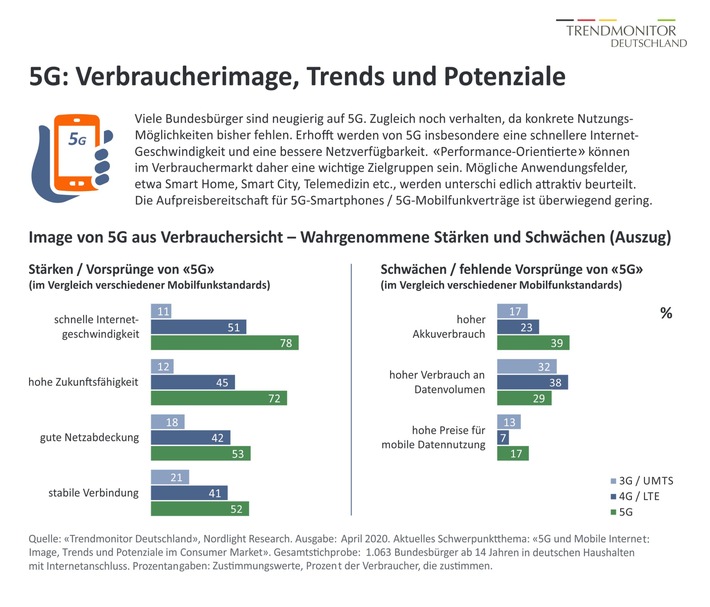 Dies sind Ergebnisse aus der der aktuellen Ausgabe des „Trendmonitor Deutschland“ des Marktforschungsinstituts Nordlight Research zum Schwerpunktthema „5G und Mobile Internet: Image, Trends und Potenziale im Consumer Market“. Rund 1.000 Bundesbürger ab 14 Jahren aus Haushalten mit Internetanschluss wurden repräsentativ zu den Themen 5G, Mobilfunk und mobiles Internet befragt.