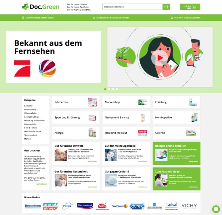 Wetter/Ruhr (ots) – In Kooperation mit Pro7 und Sat1 startet jetzt das Suchportal http://www.doc.green mit einer bundesweiten TV-Kampagne unter dem Motto „Die neue Art, Medikamente zu bestellen“. Über http://www.doc.green können Kunden sämtliche rezeptfreien Medikamente bestellen, die per Apothekenboten klimafreundlich noch am selben Tag geliefert werden. Damit zieht Doc.Green gleich mehrere Trümpfe, die exakt den aktuellen Verbrauchernerv treffen: Online-Bestellung, Same-Day-Delivery, Umweltschutz und Unterstützung der lokalen Apotheke.