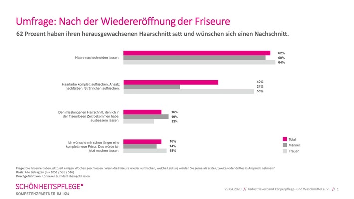 Frankfurt (ots) – Die Ergebnisse der aktuellen Umfrage des IKW zeigen, welche Dienstleistung die Deutschen nach der Wiedereröffnung der Friseure als erstes in Anspruch nehmen möchten.