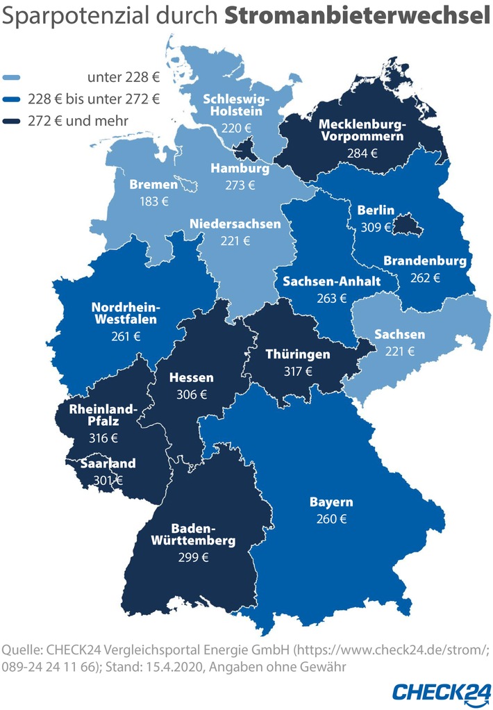 In allen Bundesländern liegt die mögliche Ersparnis durch einen Anbieterwechsel bei über 200 Euro für ein Jahr. Einzige Ausnahme: Bremen. Und auch die Hanseaten zahlen durchschnittlich immerhin 183 Euro weniger, wenn sie ihren Strom von einem der zehn günstigsten Alternativversorger statt aus der Grundversorgung beziehen.