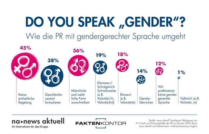 Hamburg (ots) – Einmal so, ein andermal anders: Wenn es um Gendern in der professionellen Kommunikation geht, gibt es bei den meisten PR-Experten keine einheitliche Regelung. Das ist das Ergebnis einer aktuellen Umfrage von news aktuell und Faktenkontor. Die dpa-Tochter hat bei Pressestellen und PR-Agenturen aus Deutschland nachgefragt, wie sie mit gendergerechter Sprache in der Kommunikation für ihr Unternehmen beziehungsweise für ihre Kunden umgehen. 415 Kommunikatoren haben an der Befragung teilgenommen.