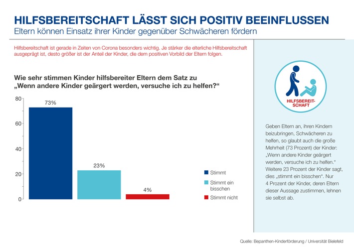 Die aktuelle Auswertung bietet aber auch gute Nachrichten: In puncto Hilfsbereitschaft gegenüber Schwächeren wirken sich die Bemühungen von Eltern grundsätzlich positiv aus – offenbar auch über alle sozioökonomischen Schichten und Gruppen hinweg. Diesen Rückschluss lässt der Vergleich der Kinder-Antworten mit denen der jeweiligen Eltern zu: Geben die Eltern an, ihren Kindern beizubringen, Schwächeren zu helfen, so sagt auch die überwältigende Mehrheit (73 Prozent) der Kinder: „Wenn andere Kinder geärgert werden, versuche ich zu helfen.“ Nur 4 Prozent der Kinder, deren Eltern dieser Aussage zustimmen, lehnen sie selbst ab.